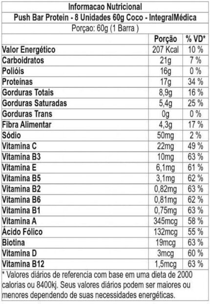 Em até 3x de R$ 29,38 sem juros Push Bar Protein – 8 Unidades 60G Coco – Integralmédica, Integral Médica
