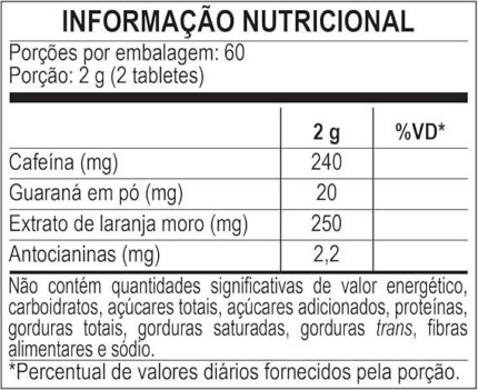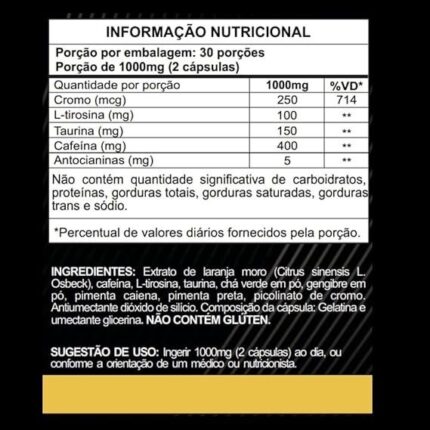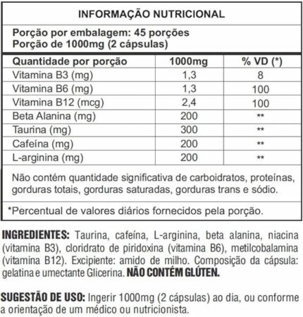 Ingredientes: L-carnitina L-tartarato, óxido de magnésio, L-triptofano, cártamo em pó, glicina, bitartarato de colina, óxido de zinco, coenzima Q10, cloridrato