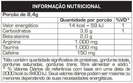 Informações de segurança   Contém Cafeína, Contem Taurina, Contem Arginina, Contem Tirosina   Indicações   Não   Ingredientes   Beta-alanina,