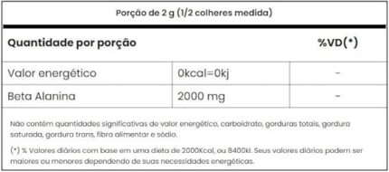 | Aditivos | 100% Beta Alanina “NÃO CONTÉM GLÚTEN” |