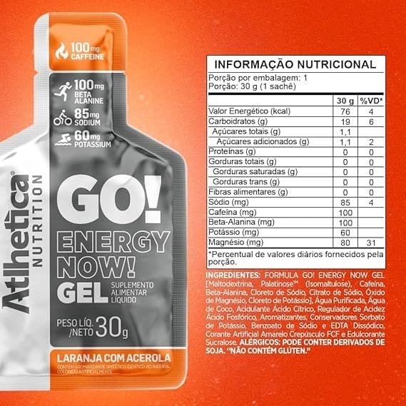 Laranja com Acerola: FORMULA GO! ENERGY NOW GEL [Maltodextrina, Palatinose (Isomaltulose), Cafeína, Beta-Alanina, Cloreto de Sódio, Citrato de Sódio, Óxido de Magnésio, Cloreto de Potássio], Água Purificada, Água de Coco, Acidulante Ácido Cítrico, Regulador de Acidez Ácido Fosfórico, Aromatizantes, Conservadores Sorbato de Potássio, Benzoato de Sódio e EDTA Dissódico, Corante Artificial Amarelo Crepúsculo FCF e Edulcorante Sucralose. “NÃO CONTÉM GLÚTEN.” “ALÉRGICOS: PODE CONTER DERIVADOS DE SOJA.”