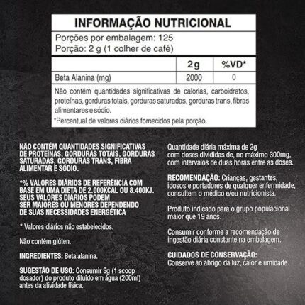 Beta-Alanina (150g) Durante a prática de exercícios de elevada intensidade, acontece grande produção e acúmulo de ácido (H+) nos músculos, sendo essa uma das principais causas da fadiga muscular, ou seja, aquela sensação de ?queimação? e cansaço no músculo. A Carnosina muscular, que é então formada pela ligação entre a Beta Alanina e Histidida, é capaz de neutralizar esses ácidos, ajudando q diminuir a fadiga muscular. Sendo a síntese de carnosina limitada pela disponibilidade de beta-alanina, a suplementação desse aminoácido é uma ótima opção para auxiliar a manter o nível dos seus treinos sempre intenso! A Beta Alanina é um aminoácido não proteogênico, ou seja, ela não participa das vias de síntese proteica. Sua principal função é o aumento de Carnosina Muscular, formada pelos aminoácidos Beta Alanina + Histidina. Este é um suplemento de alta evidência científica, recomendado pelas principais organizações, como o Comitê Olímpico Internacional, para o desempenho de atletas. Uma curiosidade sobre a Beta Alanina é que ela causa um efeito muito conhecido, denominado parestesia. A parestesia é a sensação de formigamento/pinicar, que acontece geralmente no rosto, pescoço e braços, quando há consumo de doses maiores ou iguais à 2 g. Este não é um efeito prejudicial! Benefícios: – 2g Beta Alanina, por porção;- Zero glúten, zero lactose e zero sódio;- Mais resistência;- Aumento de Carnosina Muscular;- Neutraliza sensação de queimação muscular;- Melhor desempenho;- Mais força e explosão.