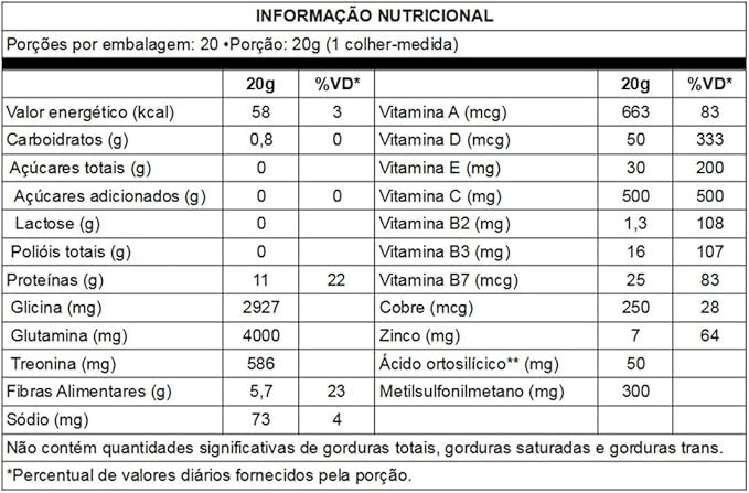 Blend de aminoácidos (L-glutamina, glicina e L-treonina), goma acácia, colágeno hidrolisado em peptídeos, ascorbato de sódio, cúrcuma (Curcuma longa), metilsulfonilmetano (MSM), ácido ortosilícico estabilizado em cloreto de colina, mix de tocoferóis, betacaroteno, acetato de tocoferol, gengibre (Zingiber officinale), bisglicinato de zinco, nicotinamida, bisglicinato de cobre, riboflavina-5-fosfato, acetato de retinol, colecalciferol, biotina, aromas naturais de laranja, blueberry, extrato de bilberry (Vaccinium myrtillus) e extrato de gengibre (Zingiber officinale), antioxidante ácido cítrico, antiumectante dióxido de silício, edulcorante glicosídeos de esteviol (estévia).