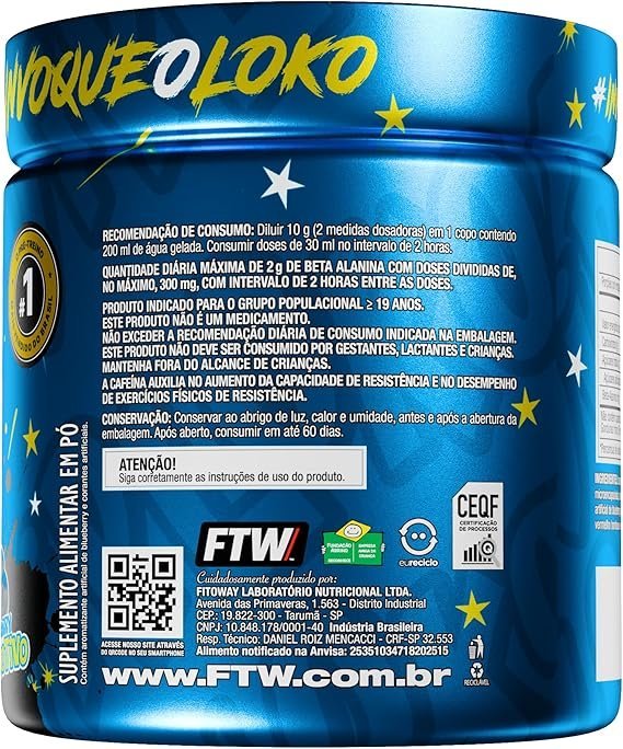 Desperte seu potencial máximo com Diabo Verde #Pre-Workout da FTW, um suplemento alimentar formulado especialmente para quem busca mais energia, foco e desempenho durante os treinos. Sua fórmula combina aminoácidos essenciais com cafeína microencapsulada, proporcionando estímulo de forma gradual e duradoura. Ideal para ser consumido antes das atividades físicas, esse pré-treino é indicado para atletas e praticantes de atividades intensas, sempre com orientação de um profissional habilitado. BENEFÍCIOS: 💪 Fórmula Energizante: Com cafeína microencapsulada para liberação gradual, ideal para manter o foco e a disposição. ⚡ Aminoácidos de Alta Qualidade: Contém beta-alanina, L-arginina, L-taurina e L-tirosina. 🧪 Isomaltulose: Carboidrato de baixo índice glicêmico que auxilia no fornecimento de energia sustentada. 🔁 Rendimento Inteligente: Pote com 300g rende aproximadamente 30 porções. ✅ Sem Glúten: Seguro para quem possui restrições alimentares. COMO CONSUMIR: Dilua 2 medidas dosadoras (10g) em 200ml de água gelada e consuma 30 minutos antes do treino. A dose diária máxima de beta-alanina é de 2g, podendo ser fracionada com no mínimo 2 horas entre as porções. INFORMAÇÕES IMPORTANTES: Produto indicado para adultos (≥ 19 anos). Não deve ser consumido por gestantes, lactantes ou crianças. Este produto não é um medicamento. Conserve em local seco, fresco e protegido da luz. Após aberto, consumir em até 45 dias. Não exceda a recomendação diária indicada na embalagem. Mantenha fora do alcance de crianças.