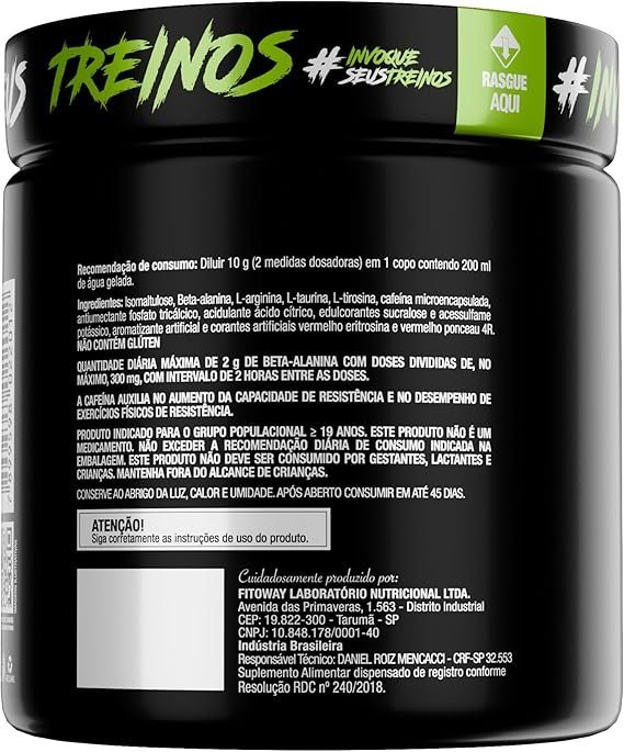 Desperte seu potencial máximo com Diabo Verde #Pre-Workout da FTW, um suplemento alimentar formulado especialmente para quem busca mais energia, foco e desempenho durante os treinos. Sua fórmula combina aminoácidos essenciais com cafeína microencapsulada, proporcionando estímulo de forma gradual e duradoura. Ideal para ser consumido antes das atividades físicas, esse pré-treino é indicado para atletas e praticantes de atividades intensas, sempre com orientação de um profissional habilitado. BENEFÍCIOS: 💪 Fórmula Energizante: Com cafeína microencapsulada para liberação gradual, ideal para manter o foco e a disposição. ⚡ Aminoácidos de Alta Qualidade: Contém beta-alanina, L-arginina, L-taurina e L-tirosina. 🧪 Isomaltulose: Carboidrato de baixo índice glicêmico que auxilia no fornecimento de energia sustentada. 🔁 Rendimento Inteligente: Pote com 300g rende aproximadamente 30 porções. ✅ Sem Glúten: Seguro para quem possui restrições alimentares. COMO CONSUMIR: Dilua 2 medidas dosadoras (10g) em 200ml de água gelada e consuma 30 minutos antes do treino. A dose diária máxima de beta-alanina é de 2g, podendo ser fracionada com no mínimo 2 horas entre as porções. INFORMAÇÕES IMPORTANTES: Produto indicado para adultos (≥ 19 anos). Não deve ser consumido por gestantes, lactantes ou crianças. Este produto não é um medicamento. Conserve em local seco, fresco e protegido da luz. Após aberto, consumir em até 45 dias. Não exceda a recomendação diária indicada na embalagem. Mantenha fora do alcance de crianças.