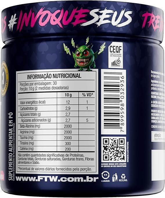 FTW Pré-Treino Diabo Verde em Pó com Cafeína, Aminoácidos Beta‑Alanina e Arginina para Treinos e Atividades Físicas – Pote 300 g (Bala de Framboesa)