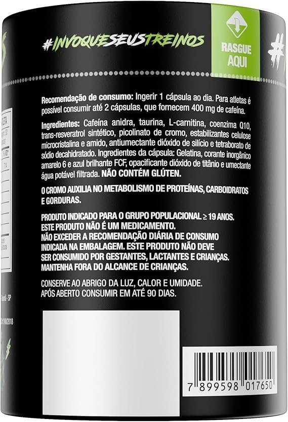 Cafeína Anidra: Estimula o sistema nervoso central, promovendo energia e reduzindo a sensação de cansaço. Taurina: Reconhecida por suas propriedades antioxidantes, contribui para a redução da fadiga muscular e melhora do desempenho físico. L-Carnitina: Auxilia no transporte de ácidos graxos para as mitocôndrias, favorecendo a oxidação de gorduras. Coenzima Q10: Essencial para a produção de energia celular, além de atuar como antioxidante. Picolinato de Cromo: Ajuda no metabolismo de macronutrientes (proteínas, carboidratos e gorduras) e no controle dos níveis de glicose no sangue. Resveratrol: Polifenol com propriedades antioxidantes, conhecido por combater os radicais livres e promover a saúde celular.