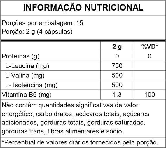 L Leucina, L Valina, L Isoleucina, Vitamina B6(Piridoxina HCL), Gelatina (Cápsula) , Antiumectante dióxido de silício. NÃO CONTÉM GLÚTEN.