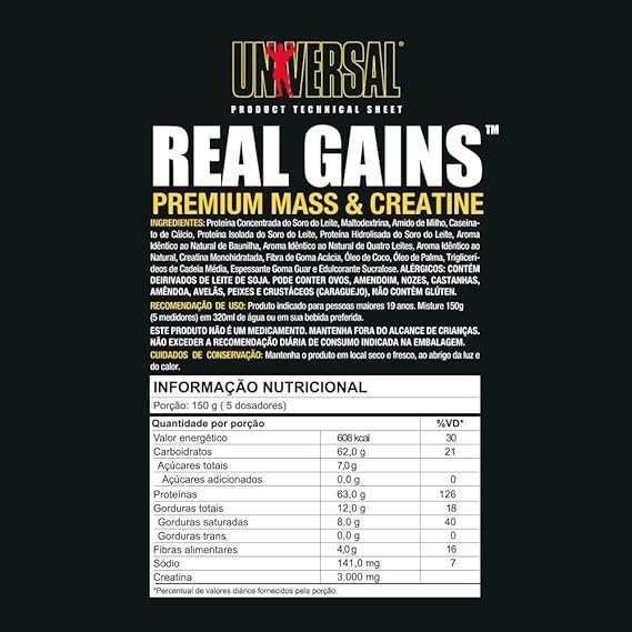 Proteína Concentrada do Soro do Leite, Maltodextrina, Amido de Milho, Caseinato de Cálcio, Proteína Isolada do Soro do Leite, Proteína Hidrolisada do Soro do Leite, Aroma Idêntico ao Natural de Baunilha, Aroma Idêntico ao Natural de Quatro Leites, Aroma Idêntico ao Natural, Creatina Monohidratada, Fibra de Goma Acácia, Óleo de Coco, Óleo de Palma, Triglicerídeos de Cadeia Média, Espessante Goma Guar e Elducorante Sucralose. Proteína