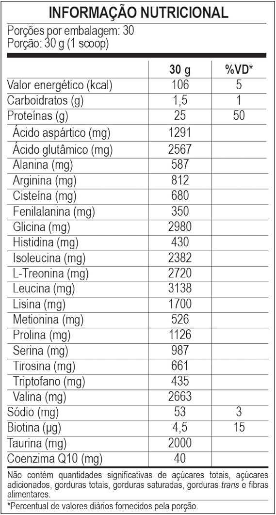 Modo de Preparo: Misture 30g (aproximadamente 1 scoop) com 150ml (1 copo pequeno) de água ou bebida de sua preferência. Variar a quantidade de líquido para obter o sabor e a consistência desejados. Sugestão de Uso: Consumir 1 (uma) porção 1 (uma) vez ao dia após o treino ou conforme orientado por nutricionista ou médico para satisfazer as suas necessidades de proteínas. Produto indicado para maiores de 19 anos. Ingredientes: Chocolate: Proteína Isolada do Soro de Leite (WPI), Proteína Hidrolisada do Soro do leite (WPH), Cacau em pó, Tetra-Build (Glicina, L-Treonina, Taurinae Biotina), Coenzima Q10, Aromatizante natural de Flor de baunilha, Espessante Goma Xantana, Antiumectante Dióxido de Silício, Edulcorante Glicosídeo Steviól (Stévia rebaudiana). NÃO CONTÉM GLÚTEN. NÃO CONTÉM LACTOSE. ALÉRGICOS: CONTÉM DERIVADOS DO LEITE. PODE CONTER DERIVADOS DO OVO E SOJA. *Produzido em equipamento onde se processam estes alimentos. Morango: Proteína Isolada do Soro de Leite (WPI), Proteína Hidrolisada do Soro do leite (WPH), Coenzima Q10, Aromatizante Natural de morango, Espessante Goma Xantana, Antiumectante Dióxido de Silício, Edulcorante Glicosídeo Steviól (Stévia rebaudiana) e corante natural carmin. NÃO CONTÉM GLÚTEN. NÃO CONTÉM LACTOSE. ALÉRGICOS: CONTÉM DERIVADOS DO LEITE. PODE CONTER DERIVADOS DO OVO E SOJA. *Produzido em equipamento onde se processam estes alimentos. Baunilha: Proteína Isolada do Soro de Leite (WPI), Proteína Hidrolisada do Soro do leite (WPH), Coenzima Q10, Aromatizante Natural de Baunilha, Espessante Goma Xantana, Antiumectante Dióxido de Silício, Edulcorante Glicosídeo Steviól (Stévia rebaudiana). NÃO CONTÉM GLÚTEN. NÃO CONTÉM LACTOSE. ALÉRGICOS: CONTÉM DERIVADOS DO LEITE. PODE CONTER DERIVADOS DO OVO E SOJA. *Produzido em equipamento onde se processam estes alimentos.