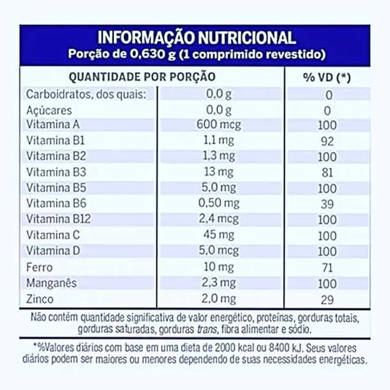 ácido ascórbico, sulfato ferroso, nicotinamida, sulfato de zinco, sulfato de manganês, d-pantotenato de cálcio, acetato de retinol, cloridrato de tiamina, riboflavina, cloridrato de piridoxina, colecalciferol, cianocobalamina, estabilizantes celulose microcristalina e croscarmelose sódica, antiumectante dióxido de silício, revestimento (estabilizante hidroxipropilmetilcelulose, agente de corpo etilcelulose, umectante triacetina, corantes inorgânicos dióxido de titânio e óxido de ferro vermelho, corante natural carmim, corantes artificiais ponceau 4R, vermelho 40, bordeaux S, amarelo de quinoleína e amarelo crepúsculo)