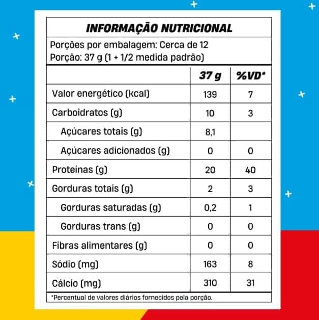 Proteína de soro do leite concentrada, amendoim torrado e moído, sal, aroma sintético idêntico ao natural, espessante goma xantana e edulcorante sucralose.