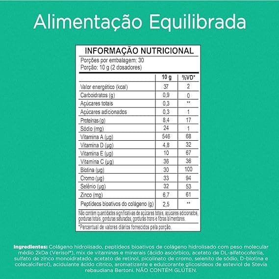 : Colágeno hidrolisado, colágeno hidrolisado bioativo (Verisol®), mix de vitaminas e minerais [vitamina C (ácido ascórbico), vitamina E (DL alfa-acetato de tocoferol), zinco (sulfato de zinco mono-hidratado), vitamina A (acetato de retinol), cromo (picolinato de cromo), selênio (selenito de sódio), vitamina H (biotina) e vitamina D (colecalciferol)], acidulante ácido cítrico, aroma sintético idêntico ao natural, edulcorante estévia e corante betacaroteno
