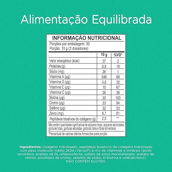 : Colágeno hidrolisado, colágeno hidrolisado bioativo (Verisol®), mix de vitaminas e minerais [vitamina C (ácido ascórbico), vitamina E (DL alfa-acetato de tocoferol), zinco (sulfato de zinco mono-hidratado), vitamina A (acetato de retinol), cromo (picolinato de cromo), selênio (selenito de sódio), vitamina H (biotina) e vitamina D (colecalciferol)], acidulante ácido cítrico, aroma sintético idêntico ao natural, edulcorante estévia e corante betacaroteno