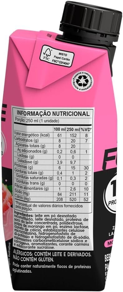 | Ingredientes | Leite em pó desnatado reconstituído, leite desnatado, soro de leite (whey) concentrado, polidextrose, polpa de morango em pó, enzima lactase, cloreto de cálcio, estabilizantes celulose microcristalina, fosfato dipotássico e fosfato dissódico, espessantes carboximetilcelulose sódica e carragena, aromatizantes, corante natural carmim de chochonilha e edulcorante sucralose. |
