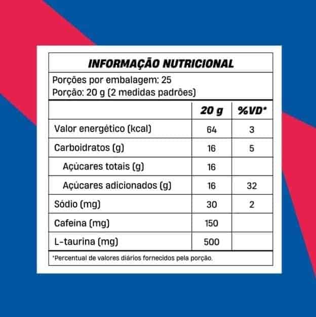 Isomaltulose (PalatinoseTM), L-taurina, cafeína anidra, chá verde em pó, pimenta em pó, gengibre em pó, acidulante ácido cítrico, aroma idêntico ao natural de amora e melancia, corante natural beterraba, antiumectante dióxido de silício, espessante goma xantana e edulcorantes xilitol e stevia.