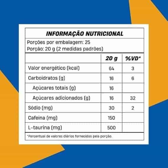 Isomaltulose (Palatinose), taurina, cafeína, chá verde em pó, acidulante ácido cítrico, aromatizante sintético idêntico ao natural, corantes naturais curcumina e extrato de urucum, antiumectante dióxido de silício, espessante goma xantana e edulcorantes xilitol e glicosídeos de esteviol produzidos enzimaticamente.