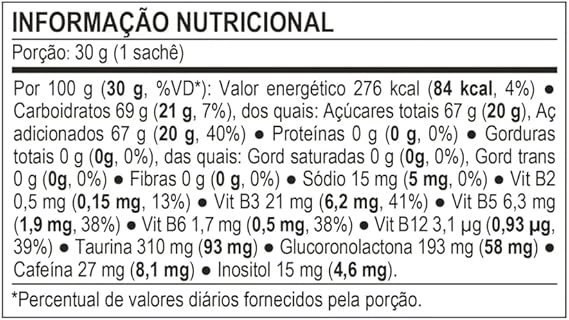 | Aditivos | Maltodextrina, água purificada, taurina (93mg/30g), glucoronolactona (58mg/30g), cafeína (8,1mg/30g), nicotinamida (niacina), inositol (4,6mg/30g), pantotenato de cálcio (ácido pantotênico), cloridrato de piridoxina (vitamina B6), riboflavina (vitamina B2), cianocobalamina (vitamina B12), amido de milho ceroso (waxy maize) |