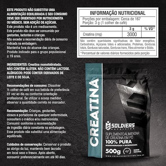 • 【FACILIDADE DE CONSUMO】 A Creatina Monohidratada Soldiers Nutrition é 100% pura e se dissolve e mistura facilmente com qualquer bebida, garantindo uma ingestão prática. Sua fórmula de alta qualidade proporciona absorção rápida e eficaz, otimizando seus treinos, capacidade cognitiva ou saúde do dia a dia.