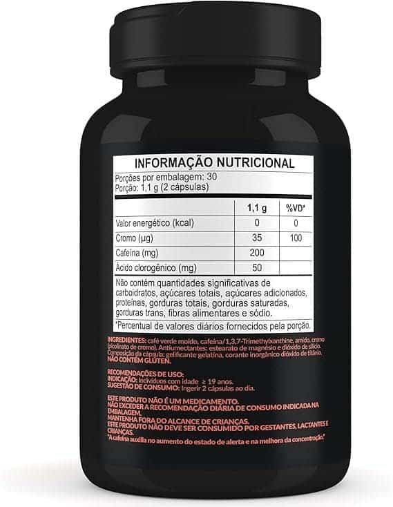 Termogênico à base de Café Verde, Cafeína e Cromo – 1 Pote com 60 Cápsulas de 550mg INDICAÇÃO: Indivíduos com idade ≥ 19 anos. SUGESTÃO DE CONSUMO: Ingerir 2 cápsulas ao dia. INGREDIENTES: café verde moído, cafeína/1,3,7-Trimethylxanthine, amido, cromo (picolinato de cromo). Antiumectantes: estearato de magnésio e dióxido de silício. Composição da cápsula: gelificante gelatina, corante inorgânico dióxido de titânio. NÃO CONTÉM GLÚTEN.