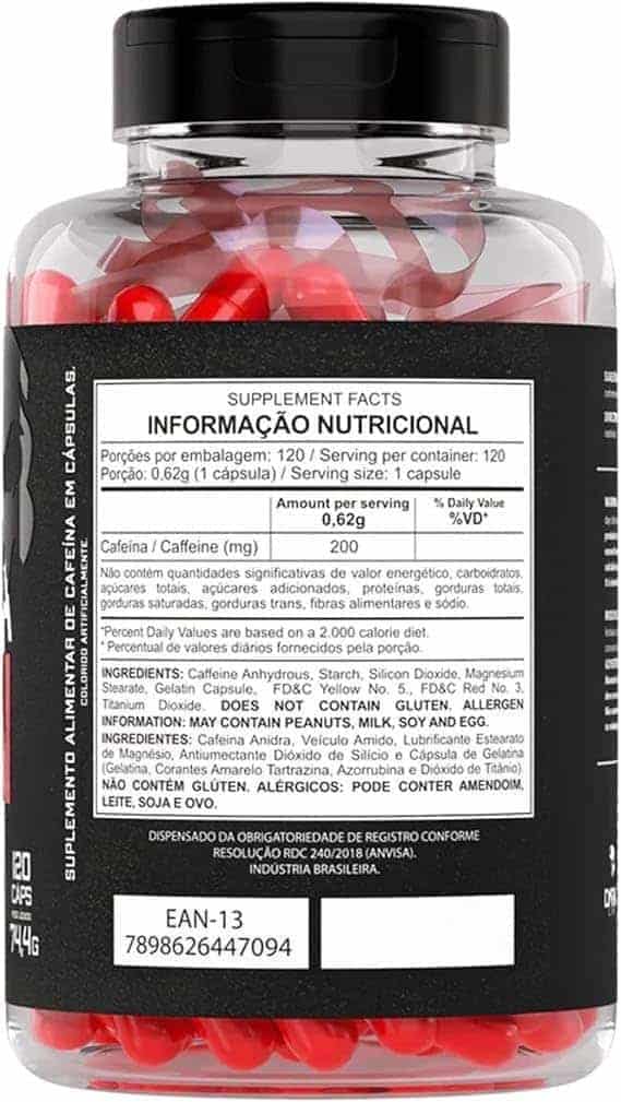 Cafeína anidra, veículo amido, lubrificante, estearato de magnésio, antiumectante dióxido de silício e cápsula de gelatina (gelatina, corantes amarelo tartrazina, azorrubina e dióxido de titânio). NÃO CONTÉM GLÚTEN.