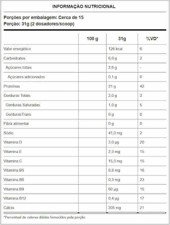 Concentrado proteico de soro de leite (concentrado proteico de soro de leite e emulsificante lecitina), maltodextrina, mix de vitaminas e mineral [fosfato de cálcio tribásico (cálcio), maltodextrina, ácido ascórbico (vitamina C), acetato de dl-alfa-tocoferol (vitamina E), colecalciferol (vitamina D), d-pantotenato de cálcio (ácido pantotênico – vitamina B5), cloridrato de piridoxina (vitamina B6), ácido fólico (vitamina B9) e cianocobalamina (vitamina B12)], estabilizantes goma guar e goma xantana, aromatizantes, edulcorante sucralose e regulador de acidez ácido cítrico.