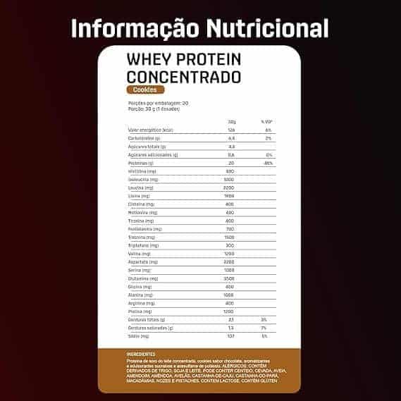 5g de BCAAs; 4,3g de glutamina e 2,5g de leucina, por dose. – O nome diz tudo: Whey Protein Concentrado 100% puro, com transparência total, do nome do produto à lista de ingredientes; – Não contém goma xantana, complexos vitamínicos à base de maltodextrina, espessantes, estabilizantes, conservantes ou qualquer outro ingrediente inferior; – Contém corantes 100% naturais. – Proteína moderna