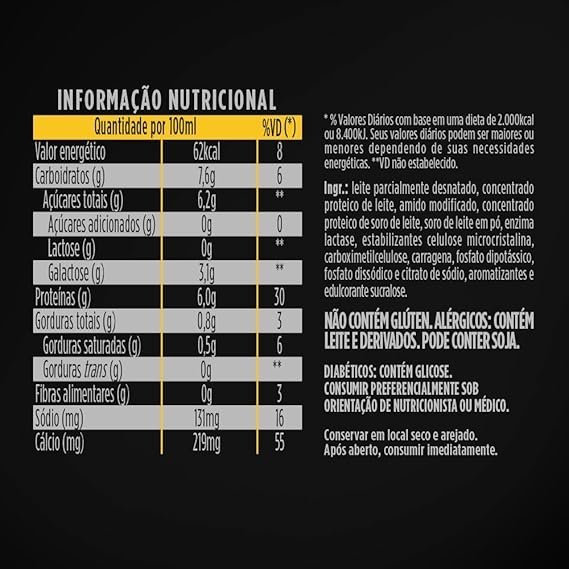 Ingr.: leite e/ou leite reconstituído parcialmente desnatado, concentrado proteico de leite, amido modificado, concentrado proteico de soro de leite, enzima lactase, estabilizantes gel de celulose, goma de celulose, carragena, fosfato dipotássico e fosfato dissódico, aromatizantes e edulcorante sucralose.