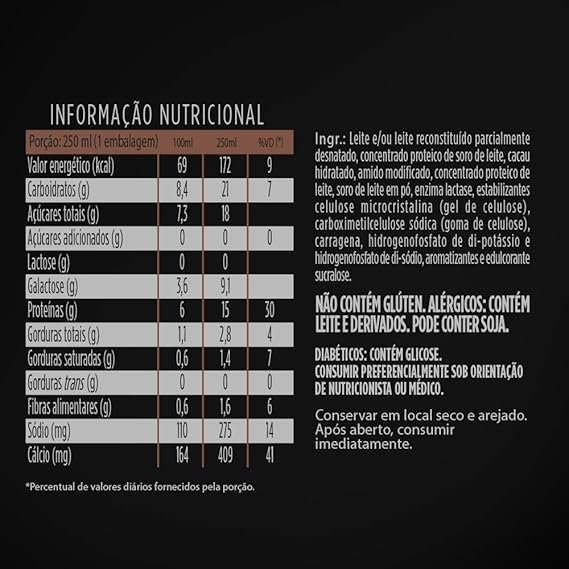 Ingredientes ‎Leite parcialmente desnatado, concentrado proteico de soro de leite em pó, cacau hidratado, amido modificado, soro de leite em pó, estabilizantes celulose microcristalina, carboximetilcelulose, carragena, fosfato dipotássico e fosfato dissódico, aromatizantes e edulcorante artificial sucralose.